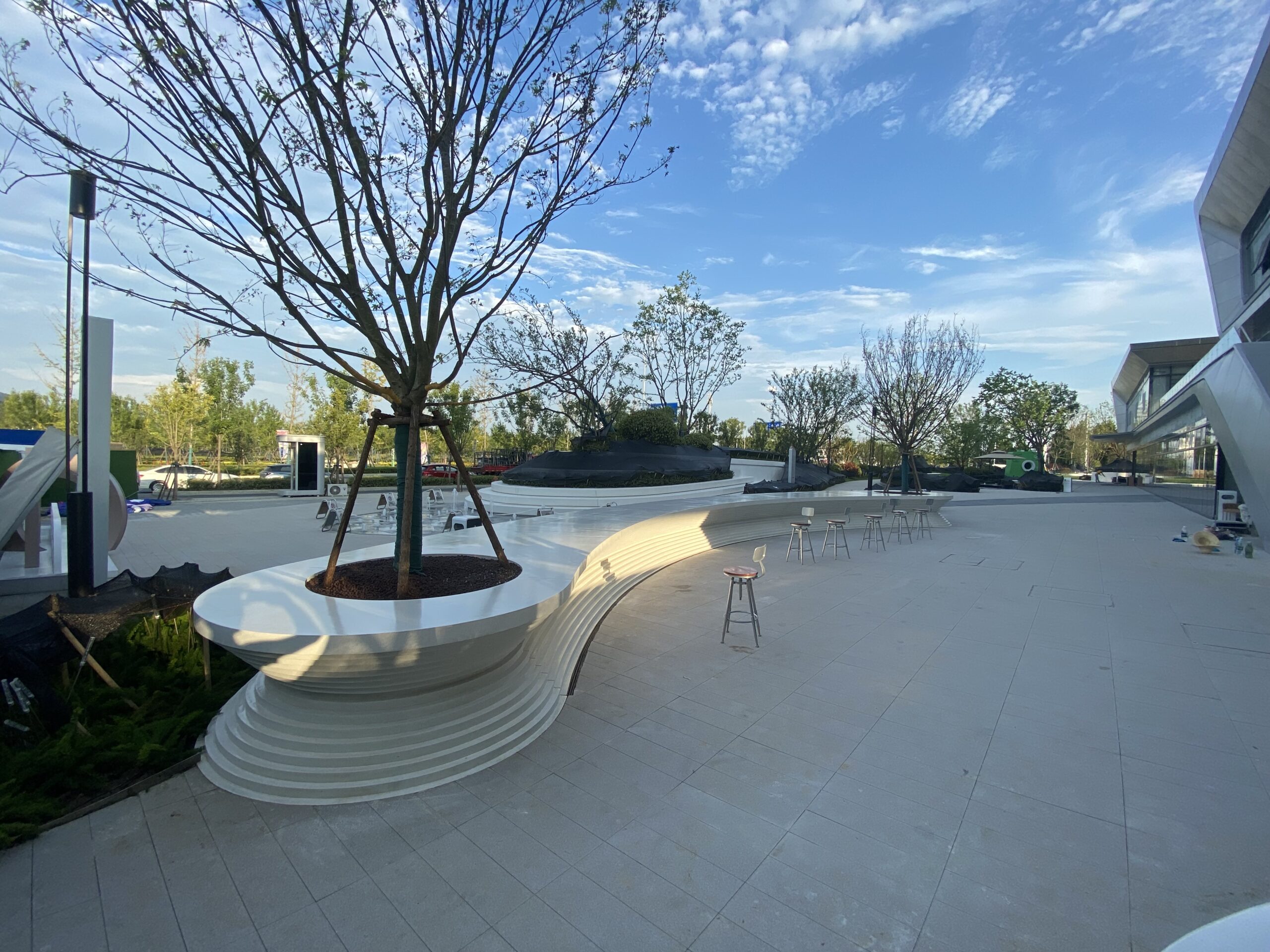 它以曲线消解了现代建筑的冷硬 —— 层层叠起的弧度裹着树池,把乔木的生机稳稳承托,坐面与绿植的无缝衔接,让自然不必 “远观”,而是成了休憩时触手可及的陪伴。